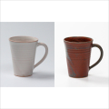 濃い赤の色合いの鉄赤釉という作風と、上品な白の色合いの白姫という作風のマグカップ大サイズのセットです。