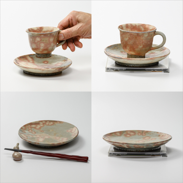 ベーシックな萩焼の色合いの御本手という作風で、朝顔形のカップ&ソーサと平皿の小サイズです。