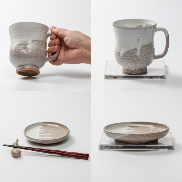 ベーシックな萩焼の色合いの白萩掛分けという作風で、胴締形に大きめの持ちやすい取手が付いたジョッキと丸形の小皿のセットです。